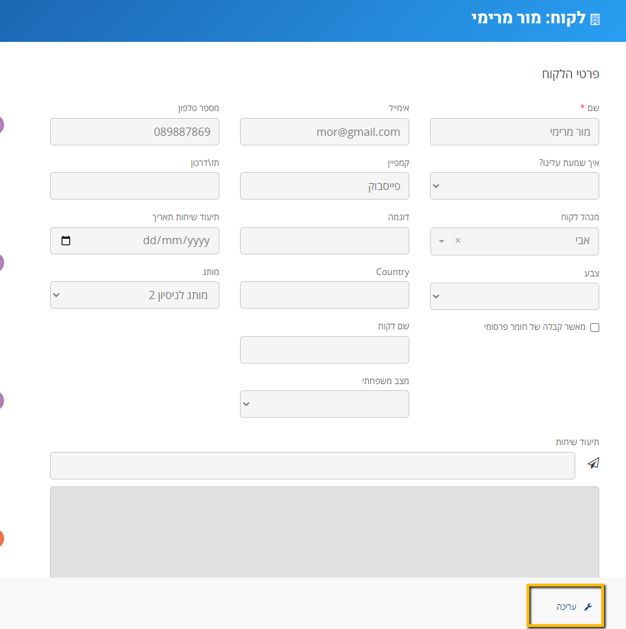 לאחר הגעה לכרטיס הרצוי, עליכם לעבור אל "עריכת כרטיס" בלחיצה על כפתור "ערוך" שנמצא בתחתית הכרטיס צד ימין.