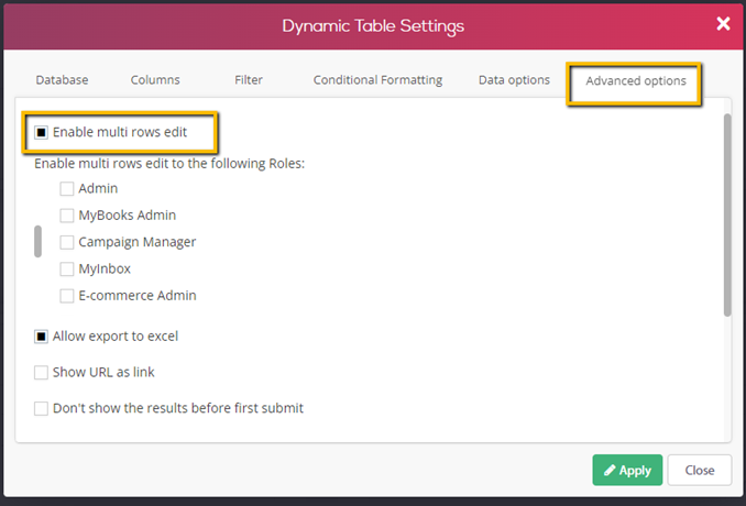 8.8 נעבור ללשונית Advanced Options. ונסמן את הצ'קבוקס Enable multi rows edit.