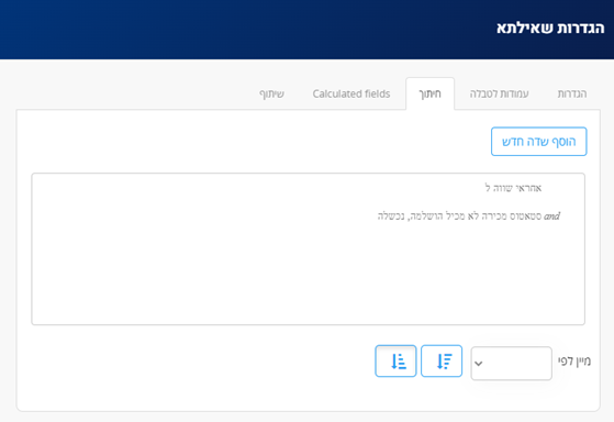 5. כברירת מחדל השאילתה מוצגת רק למשתמש שיצר אותה. אם נרצה לתת גישה לשאילתה זו גם למשתמשים אחרים, נבחר בלשונית "שיתוף" ונשתף את המשתמשים הרלוונטיים לפי פרופיל או לפי שם משתמש.