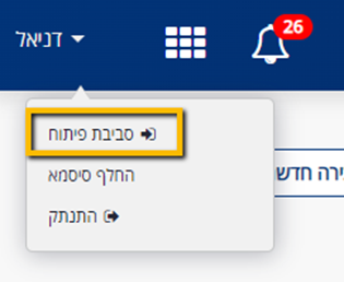 8.1. יש להיכנס לסביבת הפיתוח דרך המשתמש המורשה לכך. בצד שמאל של המסך – נלחץ על שם המשתמש ונבחר באפשרות "סביבת פיתוח"